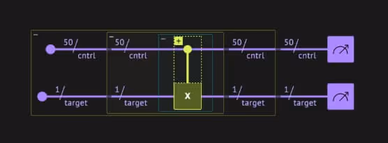 This example shows a multi-qubit control scenario. The transparent block spans the array cntrl, while the filled X gate acts on the target variable target. The visualization makes it effortless to see both the structure and the scale of the control.