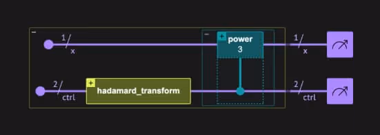 In this nested example, the control array ctrl governs a parameterized power operation, which applies a Hadamard transform on x. The transparent control region around the power(3) block makes the control flow obvious even in deeper hierarchies.